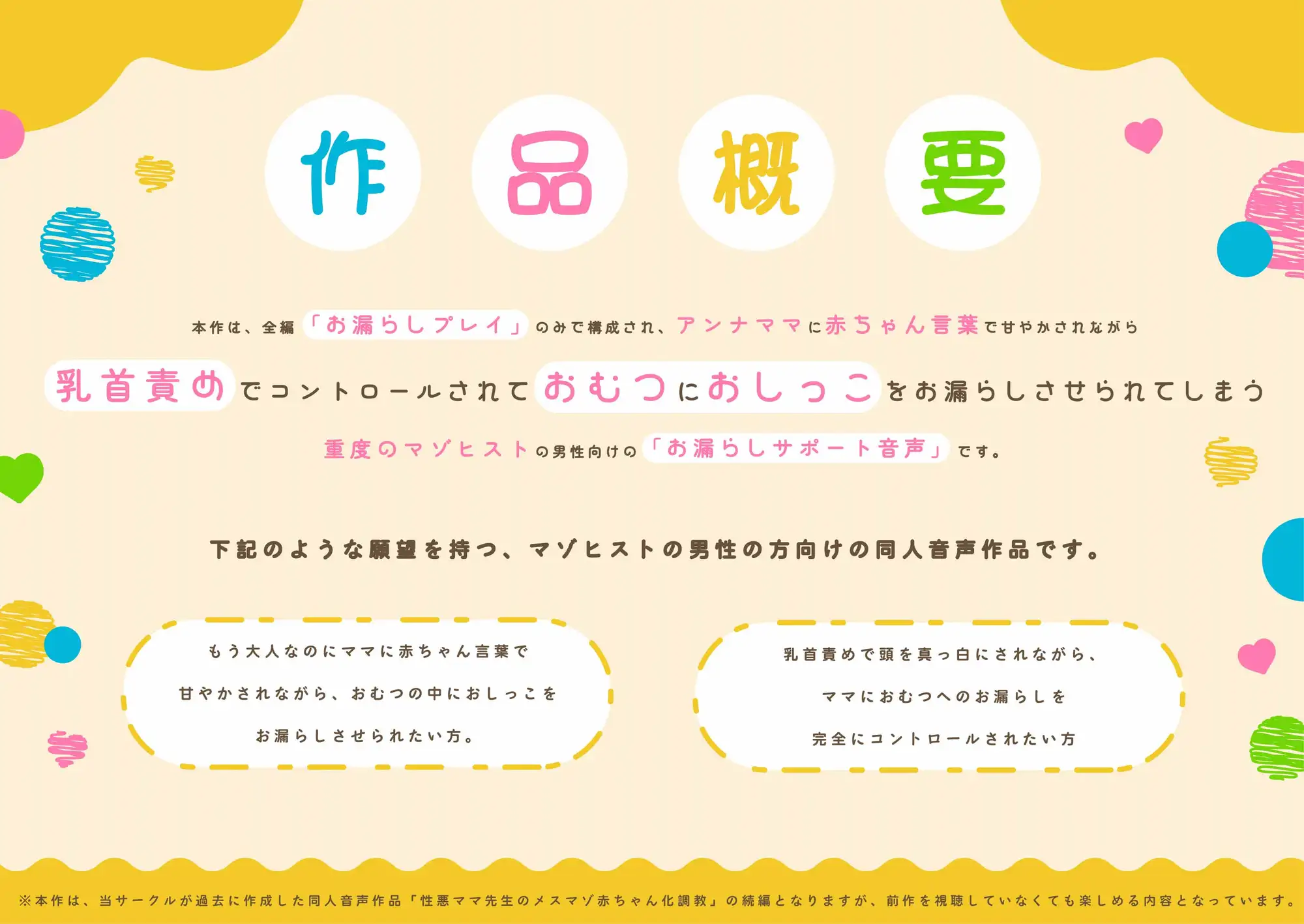 本作は、全編「お漏らしプレイ」のみで構成し、アンナママに赤ちゃん言葉で甘やかされながら乳首責めでお漏らしをコントロールされてしまう、重度のマゾヒストの男性向けの「オナニーサポート音声」ならぬ「お漏らしサポート音声」です。