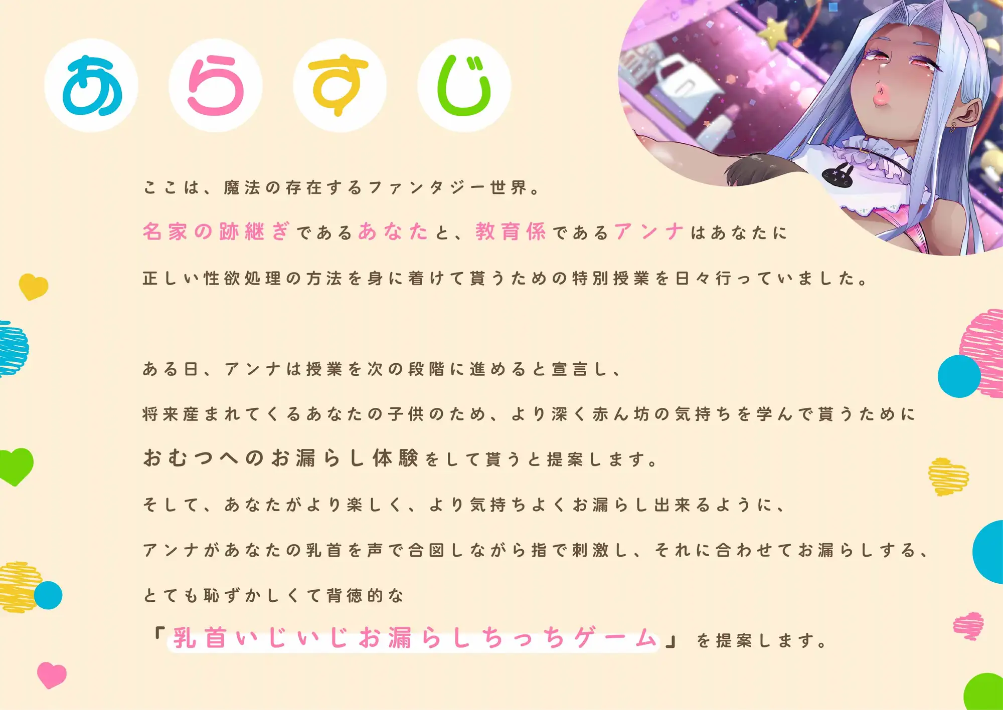 そして、あなたがより楽しく、より気持ちよくお漏らし出来るように、アンナがあなたの乳首を声で合図しながら指で刺激し、それに合わせてお漏らしする、とても恥ずかしくて背徳的な「乳首いじいじ、お漏らしちっちゲーム」を提案します。