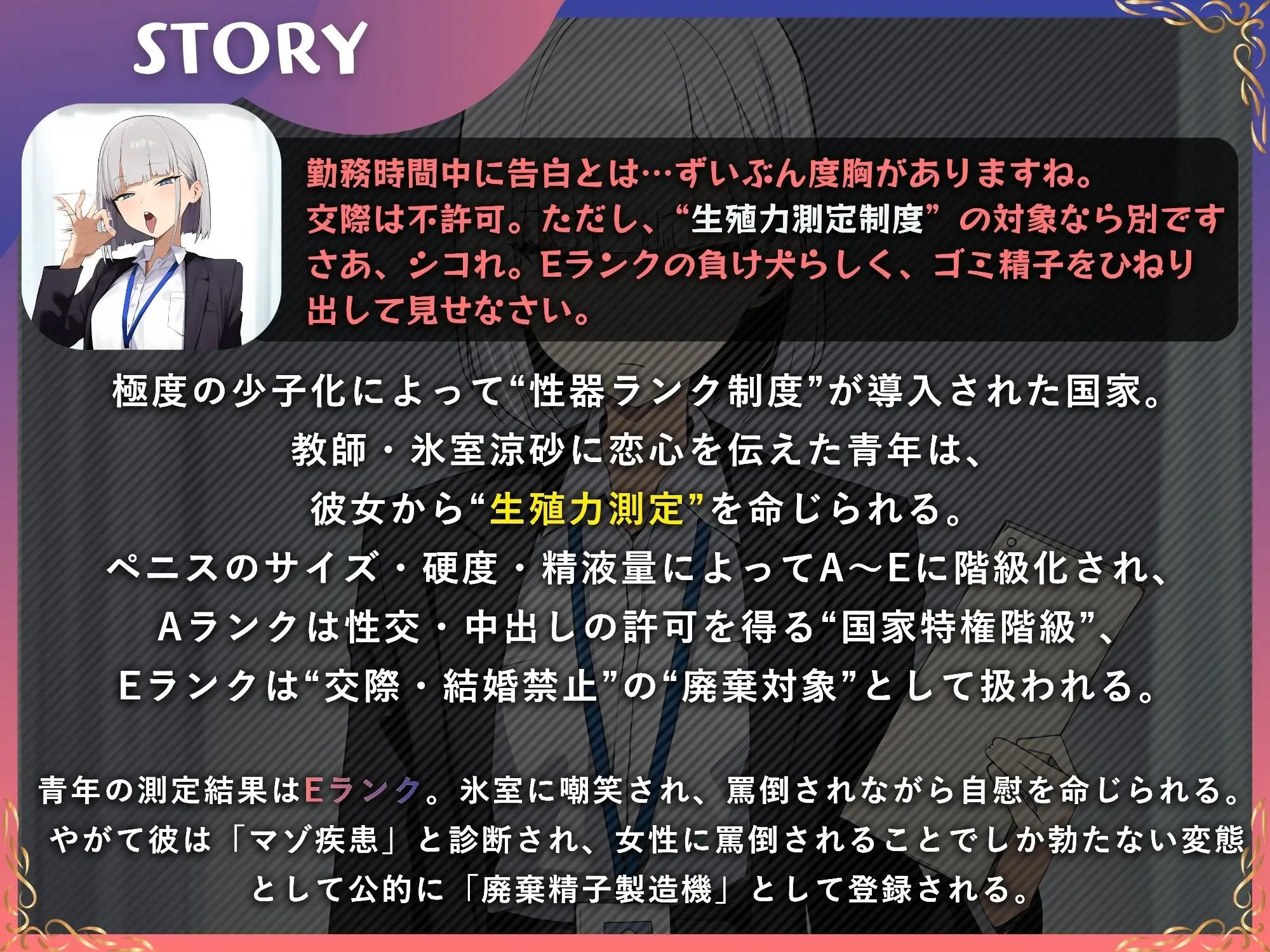 やがて彼は「マゾ疾患」と診断され、女性に罵倒されることでしか勃たない変態として公的に「廃棄精子製造機」として登録される。