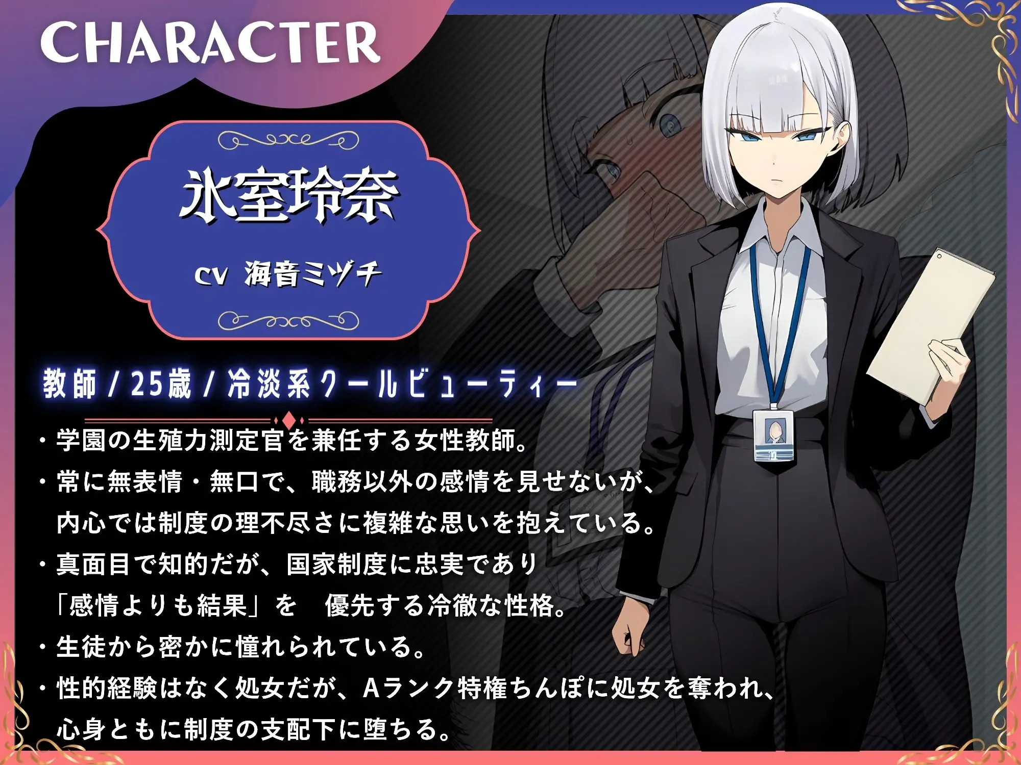 Aランク特権生徒の巨根が登場し、氷室教師が制度に従い目の前で処女を奪われる。