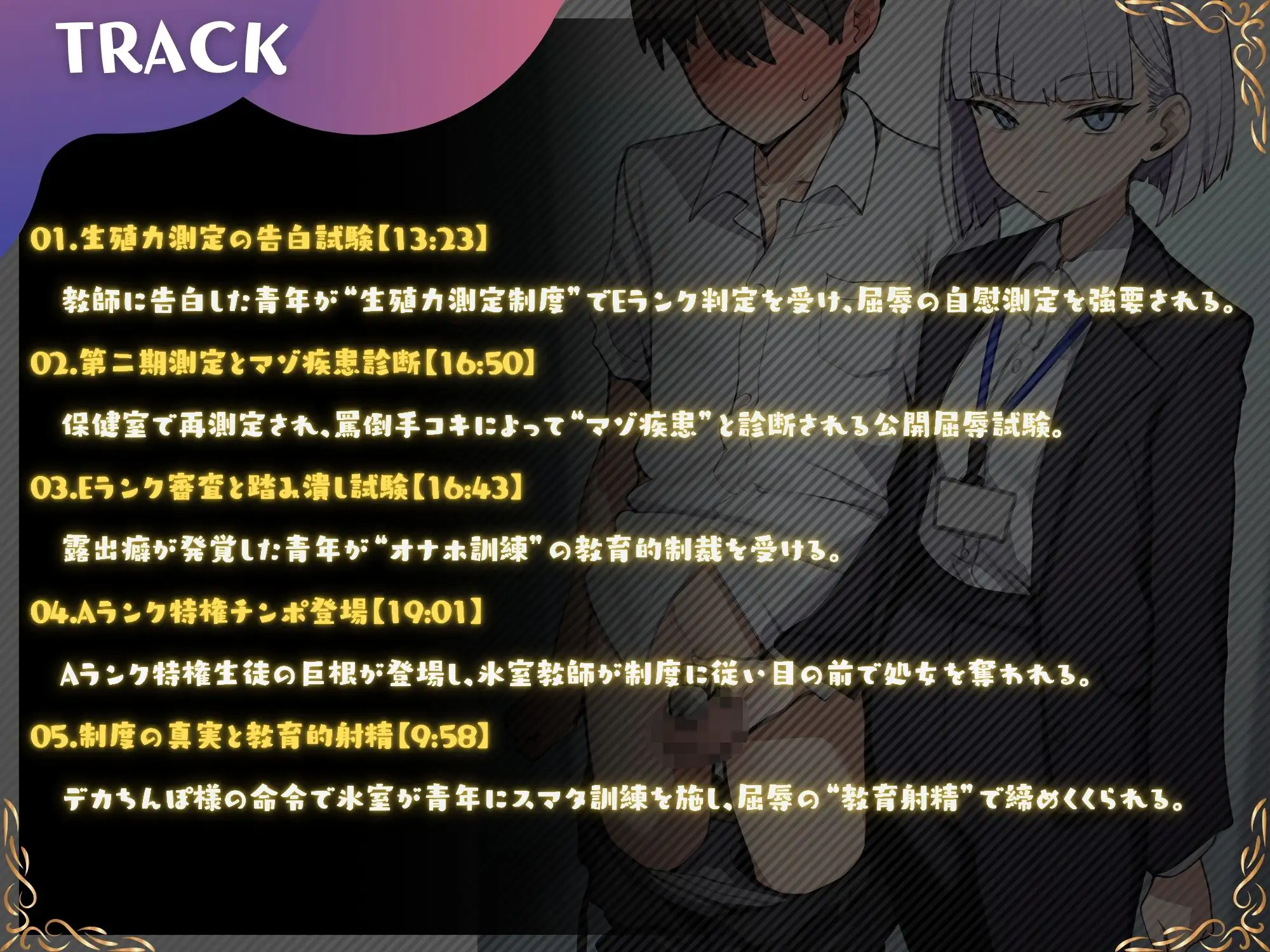 教師に告白した青年が“生殖力測定制度”でEランク判定を受け、屈辱の自慰測定を強要される。