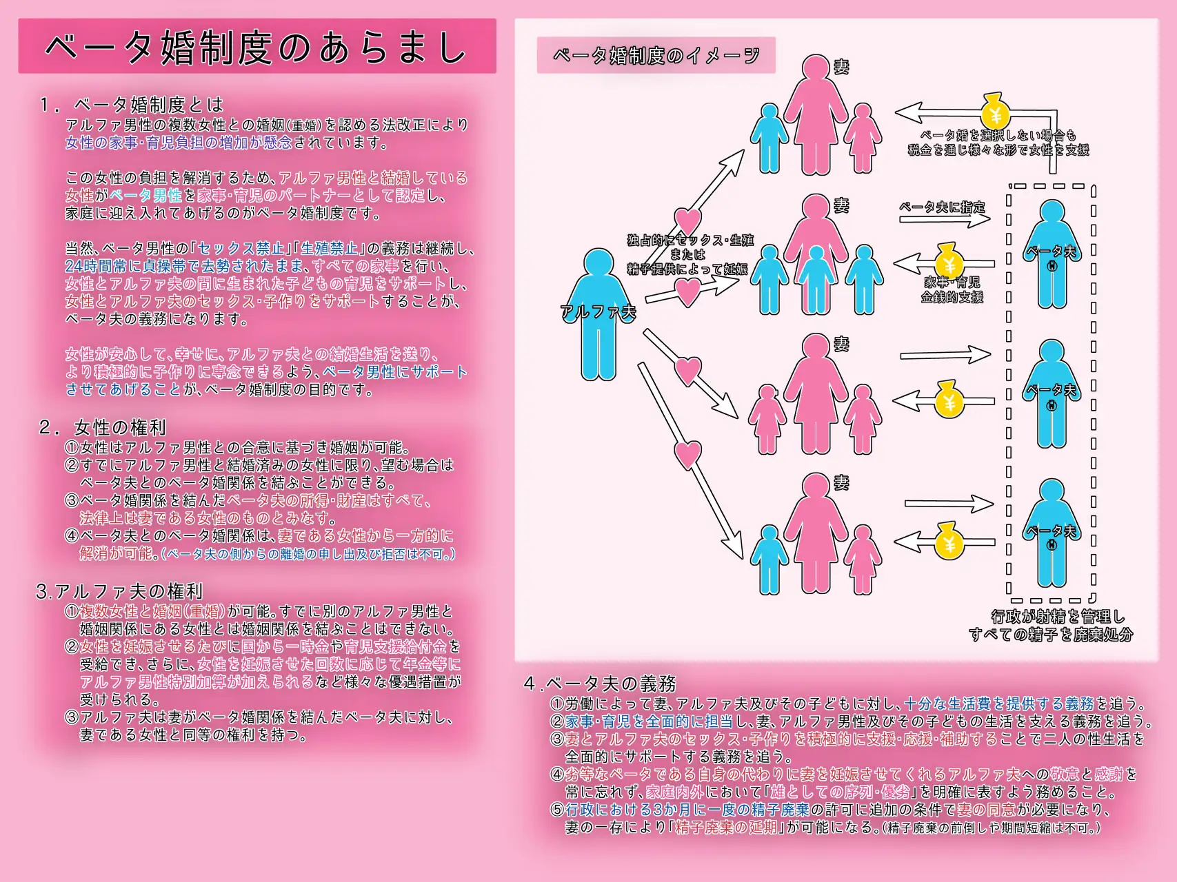 さらに、婚姻においてはアルファ男性に一夫多妻(重婚)が認められ、ベータ男性には『ベータ婚制度』という新たな婚姻の仕組みが導入された。