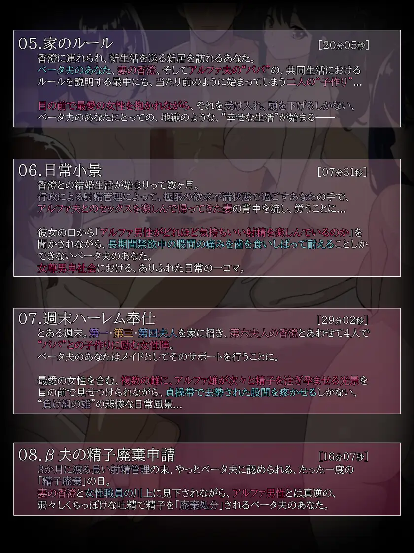 上位3.5%の優秀なアルファ男性がすべての雌と独占的にセックス・子作りを行う一方で、劣等なベータ男性たちには『セックス禁止』『貞操帯着用の義務化』『吐精は3か月に1度だけ』といった厳しい規制が課せられていた。