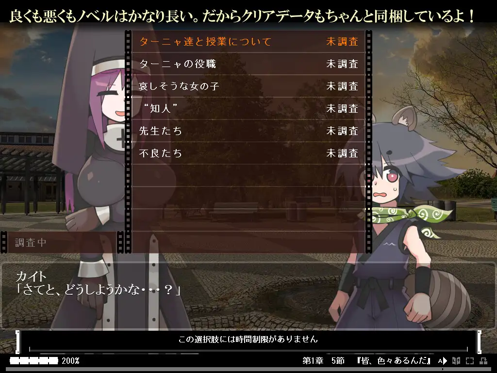 選択肢それ自体の種類もかなり数多く、時間制限のあるモノから、推理を間違えると何度も同じ選択肢を繰り返させられるモノ、間違えるとQTE的なモノで犯されてしまうモノ、項目分けで2つの選択を選ばなくてはならないモノ・・・果ては言論で戦う形式の“情報戦”に至るまで様々です。