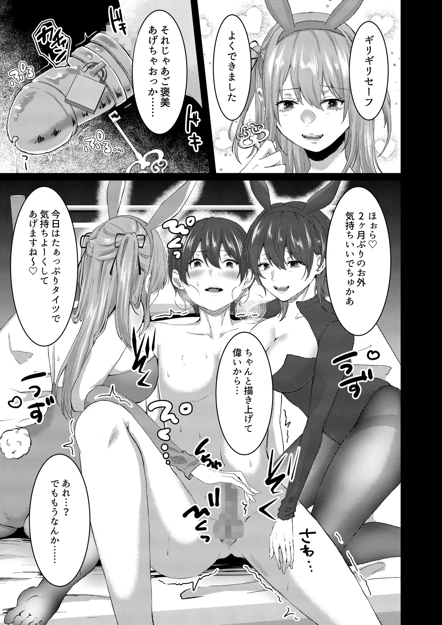 美人コスプレイヤーコンビに誘われた売れっ子同人漫画家。二人と一緒にホテルに入り、自作品キャラのコスプレに胸を高鳴らせていると、エッチな誘いをされてしまう。しかしそれは彼女たちの策略で……
