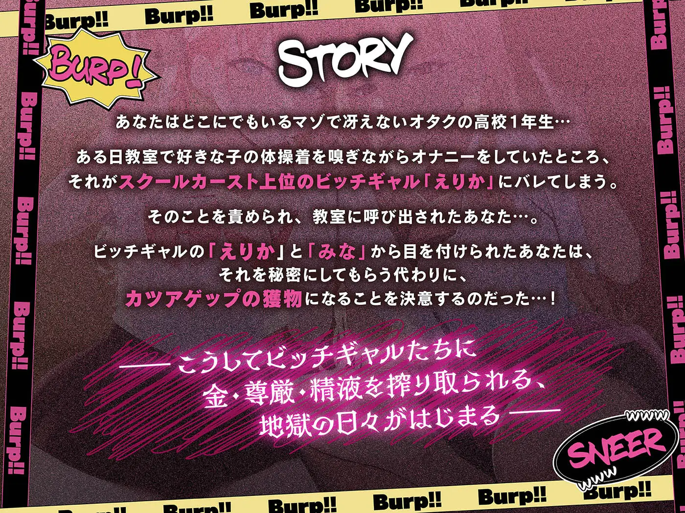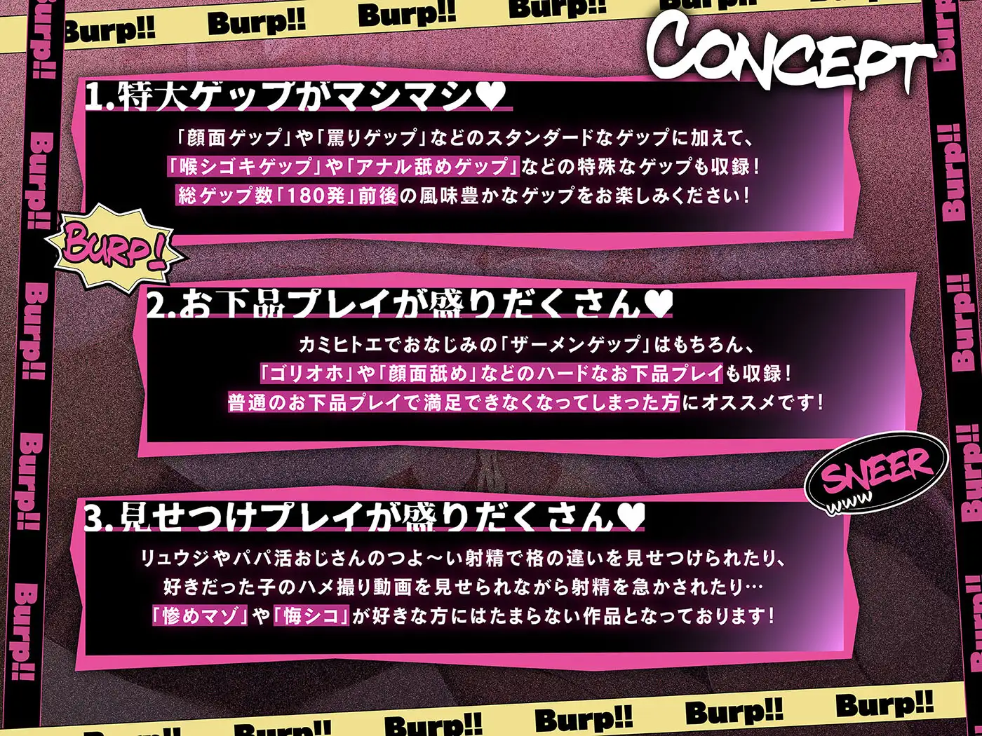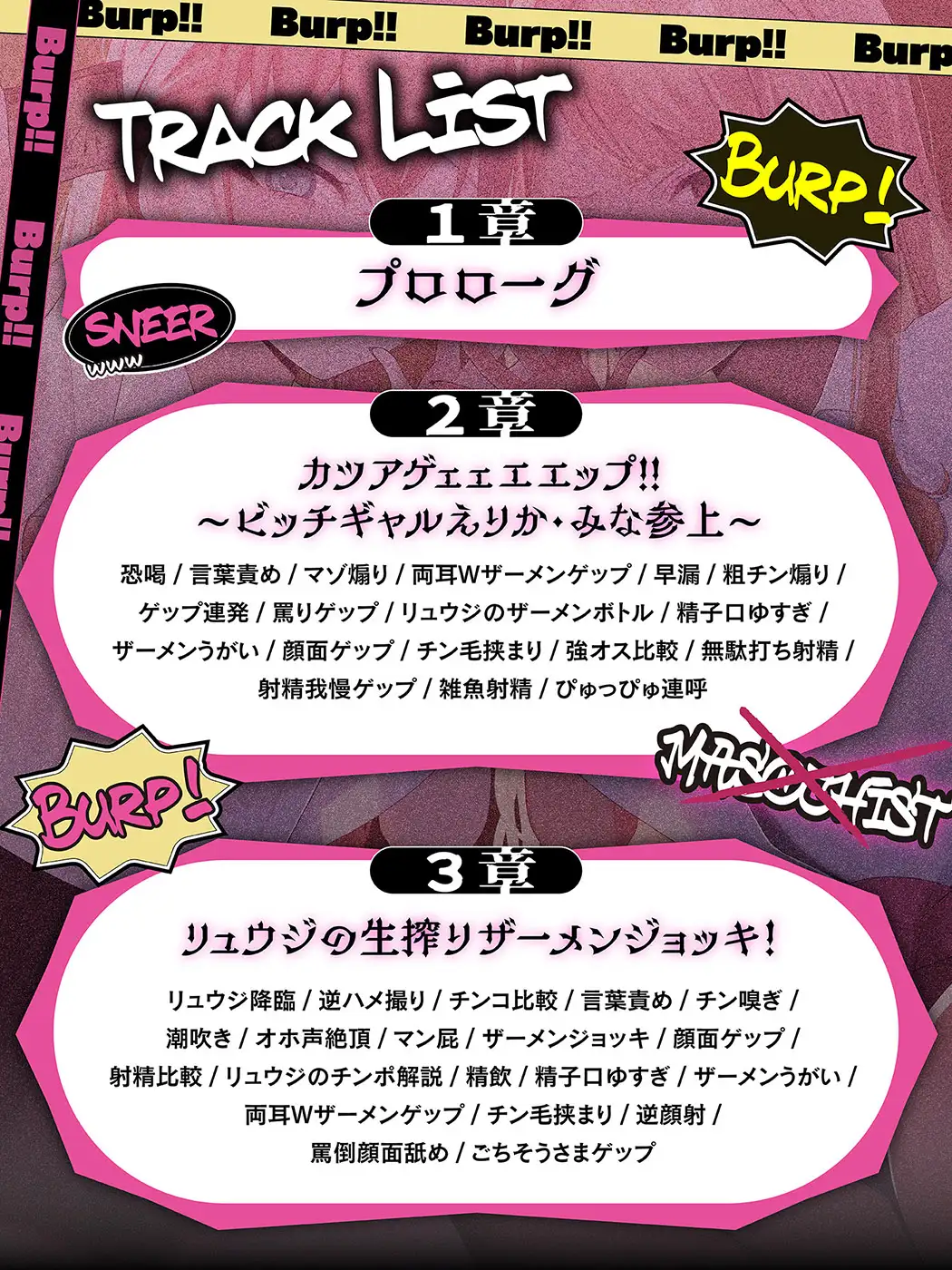 ➡ [ 恐喝 / 言葉責め / マゾ煽り / 両耳Wザーメンゲップ / 早漏 / 粗チン煽り / ゲップ連発 / 罵りゲップ / リュウジのザーメンボトル / 精子口ゆすぎ / ザーメンうがい / 顔面ゲップ / チン毛挟まり / 強オス比較 / 無駄打ち射精 / 射精我慢ゲップ / 雑魚射精 / ぴゅっぴゅ連呼 ]