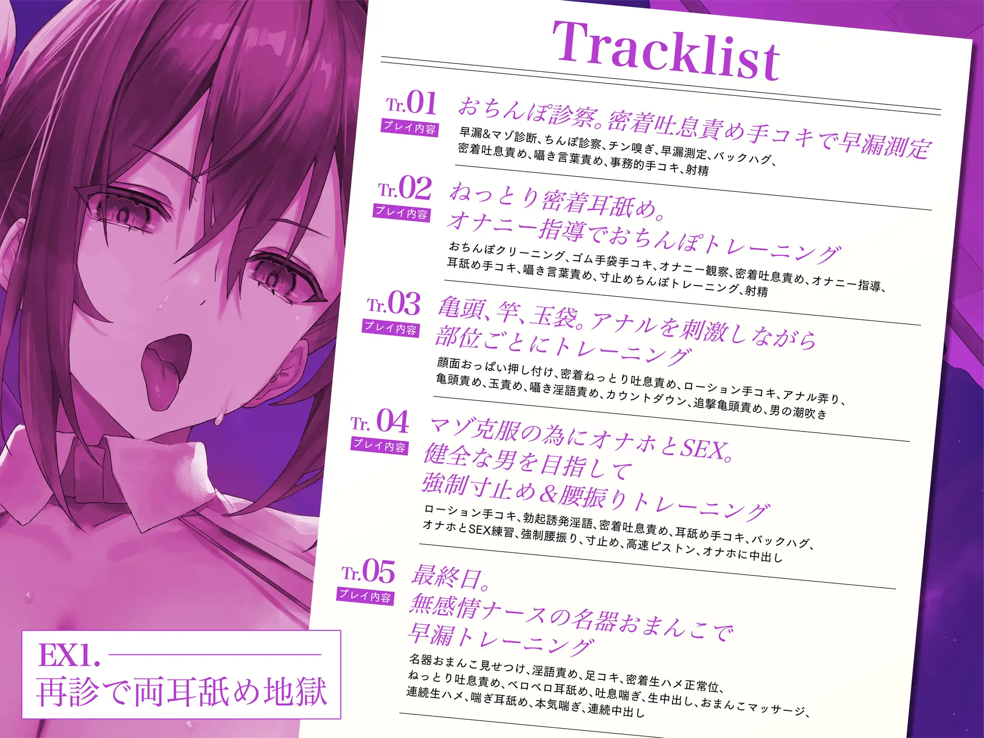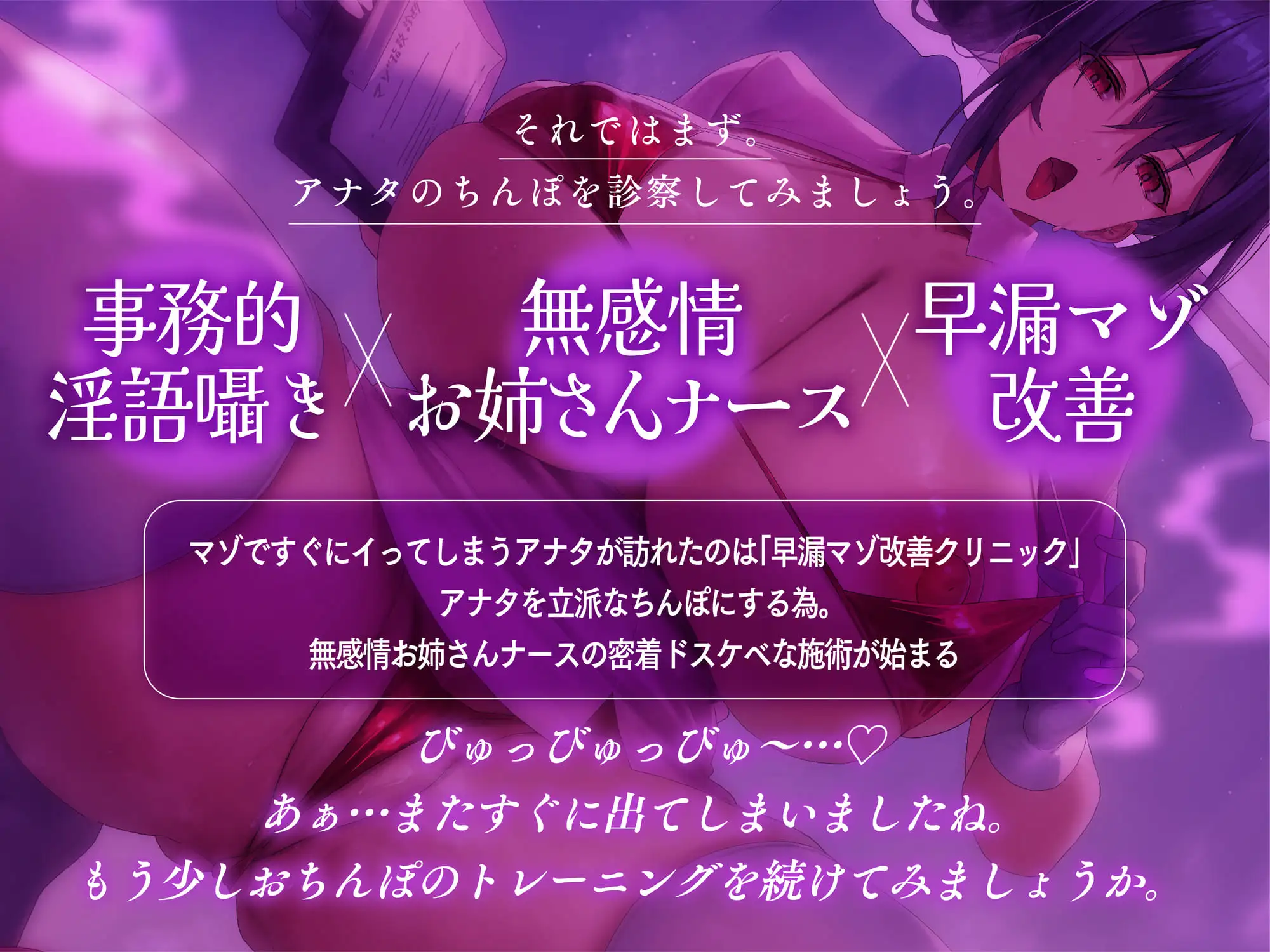 プレイ内容:おちんぽクリーニング、ゴム手袋手コキ、オナニー観察、密着吐息責め、オナニー指導、耳舐め手コキ、囁き言葉責め、寸止めちんぽトレーニング、射精